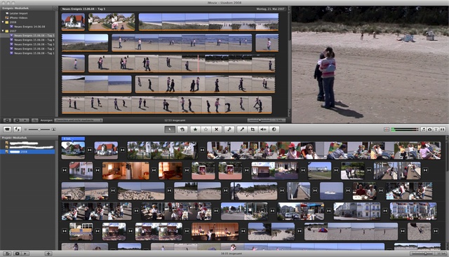 Also: Meine Sony PC-100E DVCAM per Firewire angeschlossen und den Film importiert. Soweit keinerlei Probleme. Etwas gewöhnungsbedürftig war die Aufteilung (die sich zudem bis auf einen Austausch von Ereignis-Bereich und Projekt-Bereich nicht verändern lässt), jedoch habe ich mich sehr schnell daran gewöhnt. Nach etwa einer halben Stunde hatte ich mich dann mit dem neuen Workflow angefreundet und gerade was das Schneiden bzw. Trimmen von den Szenen-Enden betrifft, ist die neue Version der alten erheblich überlegen! Problematischer ist dann schon die “neue Art” der Manipulation der Tonspur. So einfach wie das mal in iMovieHD ging, ist das jetzt nicht mehr. Die Einstell- bzw. Veränderungsmöglichkeiten sind hier stark beschränkt. Da muss ich noch etwas daran arbeiten, mal sehen, wie das wird.